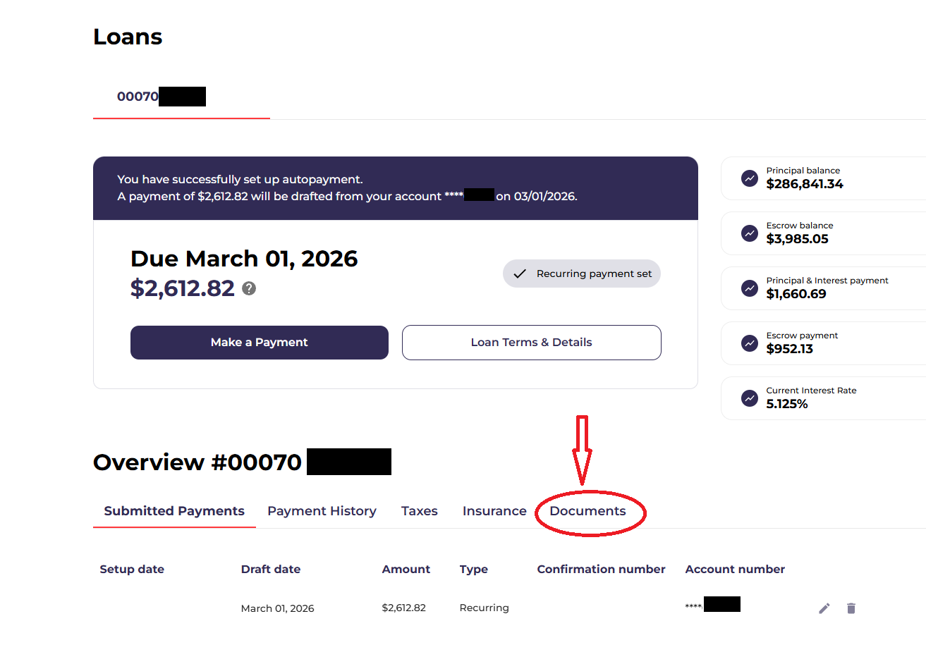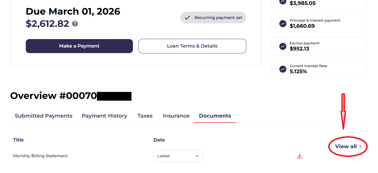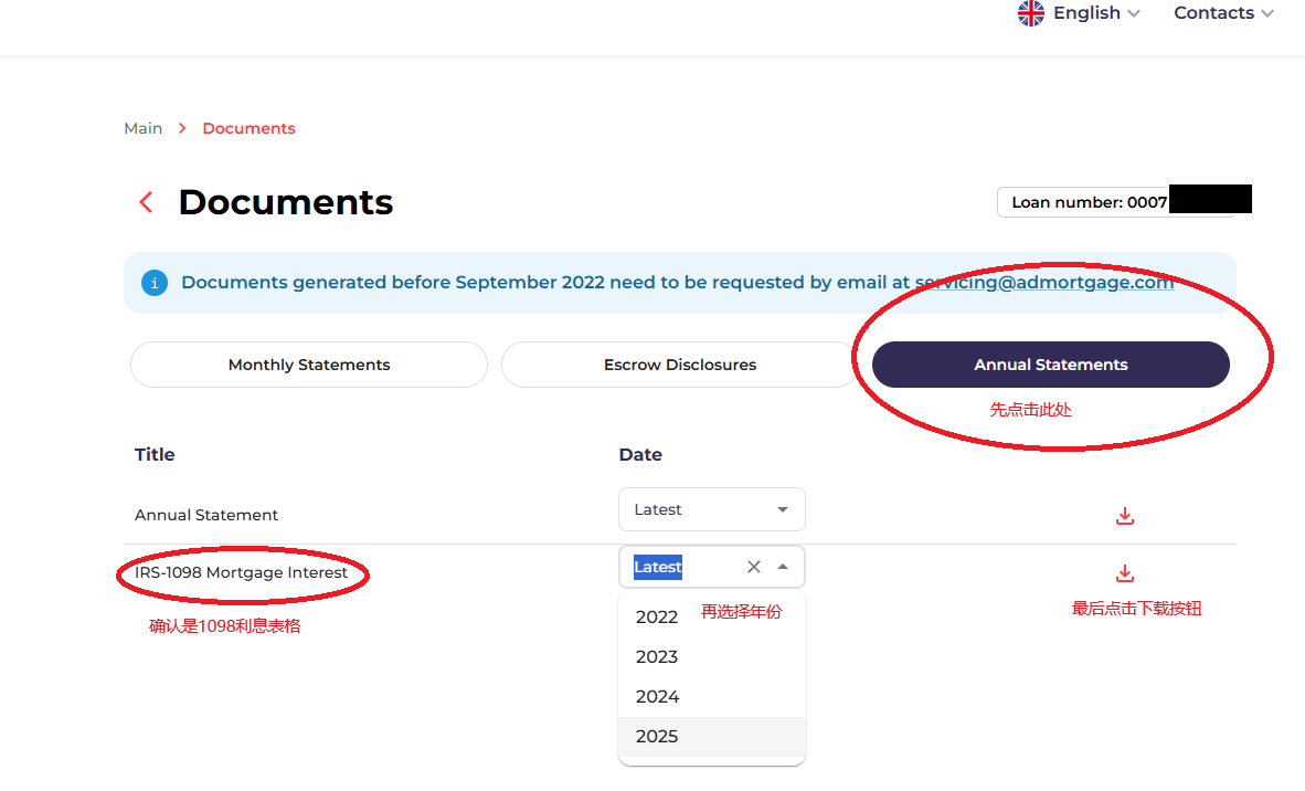 参考上面的截图,进入 Annual Statement 页面后,您应该可以看到 “IRS-1098 Mortgage Interest” 文件。